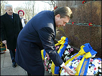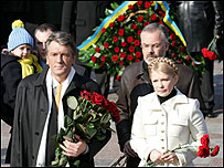 Вперше від прем’єрства Юлії Тимошенко у 2005-му році президент Ющенко з’явився на урочисту церемонію покладання квітів пліч-о-пліч із лідеркою БЮТ. Оглядачі вважають, що в такий спосіб пан Ющенко волів покласти край спекуляціям щодо нетривалості союзу "Нашої України" та Блоку Тимошенко, а також фактично продемонстрував опозицію коаліції. На церемонії такої були присутні народні депутати від БЮТ і «Нашої України», а також представники непарламентських партій націонал-демократичного спрямування. Крім того, були присутні близько 1 тис. прихильників БЮТ і “Нашої України”, які стояли з прапорами біля пам’ятника. Водночас, представників КПУ, СПУ, ПСПУ не пустили на територію парку, де проходила церемонія. | Також на цю тему Ющенко: ЄС може допомогти в протистоянні гілок влади у Києві08 березня, 2007 | УКРАЇНА ЄС подвоїть допомогу Україні07 березня, 2007 | УКРАЇНА Українці масово потерпають від торгівлі людьми06 березня, 2007 | УКРАЇНА Опозиція об'єднується в регіонах 06 березня, 2007 | УКРАЇНА ЄС не почув від прем'єра про дострокові вибори05 березня, 2007 | УКРАЇНА Антикризовики не виконають указ президента03 березня, 2007 | УКРАЇНА Ющенко: в Україні треба створити музей радянської окупації02 березня, 2007 | УКРАЇНА Ющенко та Саакашвілі не бачать альтернативи вступу в НАТО01 березня, 2007 | УКРАЇНА | ||||||||||||||||||||||||||||||||||||||||||||||||||||||||||||||||||||||||||||||||||