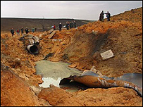 Воронка, що утворилася внаслідок вибуху магістрального газопроводу Уренгой-Помари-Ужгород біля компресорної станції Ставище. Ширина утвореної воронки складає близько 10 м., а довжина – близько 20 м.