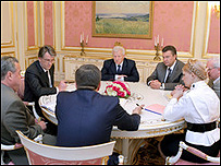 Голова Верховної Ради України Олександр Мороз звинувачує Президента України Віктора Ющенка у порушенні домовленостей щодо проведення дострокових парламентських виборів. Як повідомили у прес-службі ВР, про це Олександр Мороз сказав сьогодні під час зустрічі з членами спеціальної делегації Європейського парламенту на чолі з Адріаном Северіном. Зокрема, за словами голови ВР, це стосується втручання у діяльність судових і правоохоронних органів, продовження практики масового призначення суддів і керівників правоохоронних органів на адміністративні посади всупереч Конституції України і рішенням Конституційного Суду України, «використання посади виконувача обов`язків генпрокурора, що не передбачено Конституцією». Як стверджує Олександр Мороз, Управління державної охорони України блокує роботу Конституційного Суду України, шантажує суддів суду, вимагаючи від них не брати участі у засіданнях. Лідер комуністів Петро Симоненко звинуватив президентську сторону у державному перевороті і спробі встановлення військового управління. Тим часом, прем'єр-міністр України Віктор Янукович вважає за необхідне продовжити роботу Верховної Ради України ще на один день.