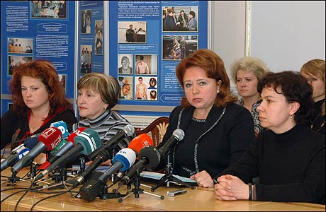 Уповноважений Верховної Ради України з прав людини Ніна Карпачова (в центрі) з родичами полонених моряків. 1 жовтня 2008 року. Фото Укрінформу