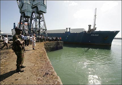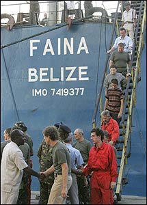 На момент захоплення на ”Фаїні” знаходилися 17 громадян України, троє росіян з Петербурга і один громадянин Латвії. Капітан судна - громадянин Росії Володимир Колобков - помер від серцевого нападу. Фото УНІАН