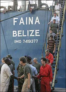 Члени команди всесвітньовідомого українського судна «Фаїна», звільненого з полону піратів Сомалі, спускаються по трапу під час прибуття в кенійський порт Момбаса (Кенія) 12 лютого цього року