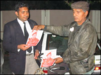 صدارتی انتخاب میں حصہ لینے کی وجہ انہوں نے صدر پرویز مشرف سے اپنی توقعات بتائیں۔ ’جب وہ آئے تو ہمیں کافی امیدیں تھیں ان سے۔ ان کی کابینہ میں دوغلہ پن تھا۔ مشرف صاحب تو فوجی جوان تھے انہیں سیاست کے پیچ و خم کہاں آتے تھے۔ وہ اب پھنسے ہوئے ہیں۔‘ ان سے ملاقات کی خواہش ظاہر کی تو وہ رات ایک بجے ہوٹل پہنچے۔ اس وقت میں آدھی نیند مکمل کر چکا تھا۔ اس رات تو غصے میں نہیں ملا لیکن دوسرے روز اتنی رات گئے آنے کی وجہ دریافت کی تو ان کا کہنا تھا کہ انہیں اپنی حفاظت کا مسئلہ درپیش ہے۔ ان کا دعویٰ ہے کہ انہیں حکومت کے ساتھ مل کر جرائم کا مقابلہ کرنے کی وجہ سے خود کش حملے کی دھمکی بھی ملی ہوئی ہے۔ ’حکومت نے مجھے سکیورٹی بھی فراہم نہیں کی تو مجھے اپنا خیال خود رکھنا پڑتا ہے۔‘ ان کی باتوں اور حلیے سے واضع ہے کہ حلقے کے لوگ انہیں کیوں سنجیدگی سے نہیں لیتے۔ انہیں اس کی کوئی خاص شکایت بھی نہیں۔ کہتے ہیں اگر دھاندلی نہ ہو تو وہ کامیاب ہو جائیں۔ ان کے ایک دستی انتخابی اشتہار پر درج ایک شعر سے ظاہر ہوتا ہے کہ وہ بھی کوئی زیادہ کامیابی کے متلاشی نہیں: منزل مجھے ملے نہ ملے اس کا غم نہیں |