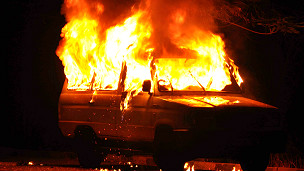 جھڑپوں کے دوران گاڑیوں کو آگ لگائی گئي