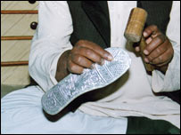 سلمی ستارے کے کارچوبی کام والی اور سلیم شاہی جوتیوں کو بھول جایۓ۔ لکھنؤ کے اشفاق احمد چاندی کی جوتیاں اور سینڈل بنانے کے ماہر کارگر ہیں۔ نوابی دور کے سبک خوشنما اور سچے ہیروں سے مزین چاندی کی جوتیاں بنانے میں انہیں کمال حاصل ہے۔ نہ جانیں کتنی خواتین چاندی کے زیرپاء اپنے پاؤں کی زینت بناکر شہزادیاں بن چکی ہیں، تھوڑی ہی دیر کے لیے سہی۔۔۔۔ اگر انیسویں صدی کے اواخر کو پیش نظر رکھیں تو معلوم ہوگا کہ نوابین اودھ کا مرکز لکھنؤ مشاق سناروں اور کاریگروں کا مسکن تھا۔ لکھنؤ سے اچھے سنار اور کاریگر اور کہیں نہ مل سکتے تھے۔ اس زمانے کے اودھ میں امراء اور وزراء کے یہاں شادی کے مواقع پر چاندی کی خاص جوتیوں کا چلن شروع ہوا۔ اشفاق احمد پچھلے تیس برسوں سے اس پیشے کو اپنائے ہوئے ہیں۔ انکے بزرگ بھی سفاری کا کام کرتے تھے۔ اشفاق احمد نے بتایا کہ ’میں نے آنکھ کھولی تو یہی کام اپنے ارد گرد دیکھا اور ثانوی تعلیم کے بعد میں بھی اس میں لگ گیا‘۔