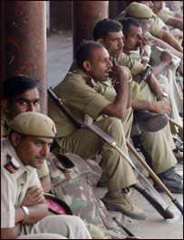مندر کے باہر تعینات پولیس اہلکار