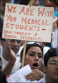 ہندوستان کے دارالحکومت دلی میں میڈیکل طلباء نے ہڑتال ختم کرنے کی وزیراعظم منموہن سنگھ کی اپیل کو مسترد کرتے ہوئے ہڑتال جاری رکھنے کا فیصلہ کیا ہے۔ سنیچر کو وزیراعظم نے اعلیٰ تعلیمی اداروں میں رزرویشن کے خلاف احتجاج کرنے والے میڈیکل اسٹوڈنٹس سے خوشگوار ماحول میں اس مسئلہ کا حل نکالنے کی صلاح دیتے ہوئے ڈاکٹروں سے ہڑتال ختم کرنے کی اپیل کی تھی۔ اس درمیان حکومت نے ہڑتال کرنے والوں کے خلاف سخت رویہ اختیار کرتے ہوئے ریزیڈنٹ ڈاکٹروں سے 24 گھنٹوں ميں ہاسٹل خالی کرنے کا نوٹس جاری کیا ہے۔ نوٹس ملنے کی تصدیق کرتے ہوئے آل انڈیا انسٹیٹیوٹ آف میڈیکل سائنسز یعنی ایمز میں ڈاکٹروں کے نمائندے ونود پاترا نے بی بی سی کو بتایا کہ ’ایمز کے اڈمنسٹریٹو یونٹ کی طرف سے نوٹس حاصل ہوا ہے جس میں لکھا ہے کہ اگر آپ ہڑتال میں شامل ہیں تو چوبیس گھنٹوں کے اندر ہاسٹل خالی کر دیں۔‘ وزیراعظم کی اپیل کے بارے میں ڈاکٹر پاترا نے کہا کہ منموہن سنگھ دو رخی بات چیت کر رہے ہیں۔ ’ایک طرف وہ بات چیت کے ذریعے اس مسئلہ کا حل نکانلے کی بات کرتے ہیں اور دوسری جانب انہوں نے ڈاکٹروں کی نوکری ختم کرنے کے بعد رام منہور لوہیا، لیڈی ہارڈنگز اور صفدر جنگ جیسے ہسپتالوں میں نئے ڈاکٹروں کی بھرتی کے لیئے اخبارات میں اشتہار بھی دے دیے ہیں۔‘ ڈاکٹروں کا کہنا ہے کہ حکومت جب تک ان کی مانگیں پوری نہیں کرتی ان کا احتجاج جاری رہے گا۔ ڈاکٹرز کا مطالبہ ہے کہ حکومت رزرویشن سے متعلق اپنی موجودہ تجویز کو فورا واپس لے اور رزرویشن کی موجودہ پالیسی پر نظرثانی کے لیئے ایک غیرسیاسی کمیٹی تشکیل دے۔ حکومت کی تعلیمی اداروں میں موجودہ سیٹوں میں اضافے کی تجویز کی پیش کش کو بھی ان ڈاکٹرز نے مسترد کر دیا ہے۔ ان کا کہنا ہے کہ یہ اس مسئلہ کا عبوری حل ہے۔ مرکزی حکومت تعلیمی اداروں میں سیٹیں مخصوص کرنے کے ساتھ ساتھ داخلوں میں اضافے پر بھی غور کررہی ہے۔ حکومت نے اس مسئلے کے حل کے لیے وزیر دفاع پرنب مکھرجی کی سربراہی میں وزراء کے ایک گرپ نے رزرویشن کے خلاف تنظیموں کے نمائندوں سے بات چیت کرنے کے بعد ایک رپورٹ تیار کی ہے۔ اطلاعات کے مطابق اس رپورٹ پر وزيراعظم مختلف سیاسی جماعتوں سے پیر کے روز سے صلاح و مشورے کا سلسلہ شروع کريں گے۔ |