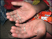 شانتا دوسرے چھ سالہ بچوں کی طرح ہی نظر آتی ہے سوائے اس کے کہ اس کے سر پر ایک کھلا زخم ہے، اس کے ہاتھ سوجے، پھٹے اور سرمئی سے ہیں۔ وہ مشکل سے چل پھر سکتی ہے۔