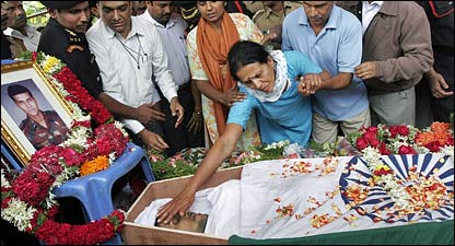 جنازے کے سفر ميں سڑک کے دونوں طرف سینکڑوں کی تعداد ميں لوگ ان اہلکاروں کو الوداع کہنے کے لیے کھڑے تھے۔ ممبئی حملوں میں 170 سے زیادہ افراد ہلاک اور 370 سے زیادہ افراد زخمی ہوئے تھے۔ اس کے علاوہ شدت پسندوں کے ساتھ تصادم میں 14 سکیورٹی فورسز بھی ہلاک ہوئے تھے۔ اے ٹی ایس کے چیف چھبیس نومبر کی رات شدت پسندوں کی جانب سے کی گئی فائرنگ ميں ہلاک ہوئے تھے۔ اے ٹی ایس کے سربراہ ہیمنت کرکرے مالیگاؤں کیس کی تحقیقات میں مصروف تھے اور انہیں کچھ روز سے دھمکیاں موصول ہو رہی تھیں۔ مالیگاؤں دھماکے کی تفتیش کے دوران سادھوی پرگیا سنگھ، لفٹیننٹ کرنل پرساد پروہت سمیت دو افراد کو گرفتار کیا تھا۔ کر کرے سات برس تک ہندوستان کی خفیہ ایجنسی راء میں رہے تھے اور اسی برس جنوری میں انہيں اے ٹی ایس کا چیف مقرر کیا گیا تھا۔ 31 سالہ میجر اننی کرشن سنیچر کی صبح تاج ہوٹل میں شدت پسندوں کے خلاف کاروائی میں مارے گئے تھے۔ وہ گزشتہ دو برس سے بلیک کیٹ کمانڈو فورس میں تھے۔ ممبئی کے ناریمن ہاؤس میں شدت پسندوں کے ساتھ تصادم میں مارے گئے این ایس جی کے ہولدار گجیندر سنگھ کا جنازہ ان کے آبائی وطن دہرادون لے جانے سے پہلے دلی لایا گیا تھا۔ گجیندر سنگھ 51 ویں سپیشل ٹاسک فورس کے ممبر تھے۔ |