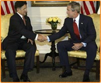 پاکستان امریکہ کی دہشت گردی کے خلاف جنگ میں صفِ اول کے حلیفوں میں سے ہے۔ پاکستان کی اس پالیسی کا سہرا جنرل مشرف کے سر پر باندھا جاتا ہے جس کا اعتراف امریکی صدر جارج بش بھی اور کئی اہم امریکی اہلکار بارہا کر چکے ہیں۔ خود جنرل مشرف بھی صدر بش سے اپنے قریبی سیاسی اور ذاتی مراسم کا اظہار کرتے ہیں۔ صدر بش اور صدر مشرف کی یہ تصویر ستمبر میں اقوامِ متحدہ کے اجلاس کے ایک دن بعد نیویارک کے ایک ہوٹل میں ملاقات کے دوران لی گئی۔ اس کےلئے کم سے کم الفاظ میں عنوان تجویز کیجئے۔