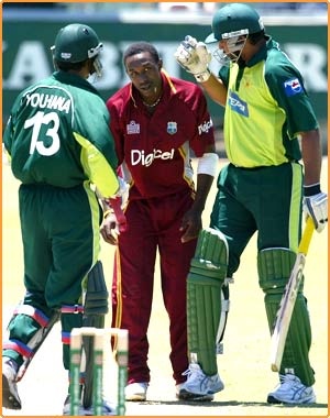 ان دنوں آسٹریلیا میں تین ممالک کے درمیان ایک روزہ کرکٹ سیریز ہو رہی ہے۔ اس سیریز میں پاکستان، آسٹریلیا اور ویسٹ انڈیز حصہ لے رہے ہیں۔ یہ تصویر اسی سیریز میں پاکستان اور ویسٹ انڈیز کے درمیان ہونے والے اس میچ سے لی گئی ہے جسے پاکستان نے تیس رن سے جیت لیا۔ یہ تصویر پاکستانی ٹیم کے یوسف یوحنا اور انضمام الحق اور ویسٹ انڈیز کے بولر ڈی جے براوو کے درمیان اس لمحے کی ہے جب ایک مس فیلڈنگ کی وجے سے بال باؤنڈری لائن عبور کر گئی اور چوکا ہوگیا۔ اس کے لیے کم سے کم الفاظ میں عنوان تجویز کریں۔