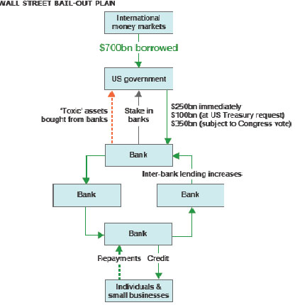 منصوبے کے تحت امریکی وزیر خزانہ ہنری پولسن اس سرمائے سے بڑے مالیاتی اداروں کے مشکوک قرضوں کی خریداری کریں گے اور اس کے بدلے میں امریکی ٹیکس دہندگان کو ان بینکوں میں نان ووٹنگ اختیار حاصل ہو جائے گا جن کے قرضے خریدے جائیں گے۔ اس طرح اگر بینک اس بحران سے نکل کر منافع میں آئے تو ٹیکس دہندگان کو بھی منافع حاصل ہو سکے گا۔ تاہم اگر ٹیکس دہندگان کو خسارہ ہوا تو مالیاتی اداروں کو اس کی کچھ نے کچھ قیمت ادا کرنی ہو گی۔ بینکوں کے سربراہوں اور اعلیٰ عہدیداروں کی تنخواہوں اور مالیاتی فوائد پر پابندیاں لگا دی جائیں گی اور اب انہیں ملازمتیں چھوڑنے کے صورت میں نام نہاد گولڈن پیرا شوٹ اور ان جیسے بھاری معاوضے حاصل نہیں ہو سکیں گے۔ بینکوں اور مالیاتی اداروں کو مستقبل میں مارٹگیج قرضوں میں خساروں سے تحفظ کے لیے ’انشورنس پالیسیاں‘ خریدنا ہوں گی۔