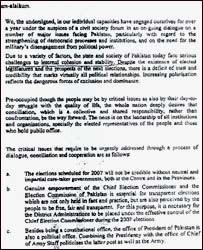 اب یہ تو نہیں معلوم کہ اس خط سے باوردی صدر جنرل پرویز مشرف کی کرسی کتنی ہل گئی ہے لیکن ایسی خبروں پرگجرات کے چودھریوں اور سندھ کے وزیرِاعلی ارباب رحیم کو اپنی کرسیاں ہلتی نظر آتی ہیں۔ جنرل مشرف تو پاکستان میں ایک مختلف اور دور دراز سیارے پر رہتے ہیں اور سکاچ سے بھی زیادہ طاقت کے نشے میں انہیں اپنے ان پیٹی بھائيوں کے خط کا ایسا نفسِ مضمون برا لگے گا اور محمد علی درانی جیسے ملا دو پیازے کی باتیں ان کے کانوں کو شہنائي لیکن وقت کے چور قدموں کے آوازیں کہہ رہی ہیں کہ انہیں ایسے خط کو تار (ٹیلیگرام) سمجھ کر پڑھنا چاہیے کیونکہ یہ کوئی جاوید ہاشمی کا خط تو ہے نہیں کہ وہ برا منائیں اور اسے’ بغاوت‘ سمجھ لیں! ذرا اپنی قوت تخیل کو آزمائيے! بلوچستان پر پاک فضائيہ کے بمبار طیارے بمباری کر رہے ہیں، حکومت کے ہر غلط کام کو صحیح ثابت کرنےکی سرتوڑ کوشش میں بے پر کی اڑانے والے وزیر محمد علی درانی ہوں اور ملک میں از غیبی لیکن منفی قوتیں اپنے ہی عوام کے ساتھ حالت جنگ میں ہوں تو حالات یقیناً انیس سو اکہتر سے ستر گنا بڑھ کر ہی لگ رہے ہیں۔ | اسی بارے میں ’مشرف وردی اتار دیں‘23 July, 2006 | پاکستان ’فوجی سربراہ کے عہدے پر سیاسی رنگ چڑھ گیا‘25 July, 2006 | پاکستان ’ریٹائرڈ جرنیلوں کا مشورہ غیر اہم ہے‘ 25 July, 2006 | پاکستان ’میگا کرپشن آف مشرف گورنمنٹ‘ 26 July, 2006 | پاکستان | ||||||||||||||||||||||||||||||||||||||||