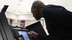 • چیف جج بِل پارٹلو پولنگ شروع ہونے سے پہلے ووٹنگ مشین کا لاک کھولنے کے لیے کوڈ ٹائپ کر رہے ہیں۔