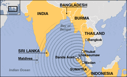 بحر ہند میں آنے والے زلزلے سے پیدا ہونے والی دیوہیکل لہروں نے انڈونیشیا سے بھارت اور افریقہ میں صومالیہ تک کے ساحلی علاقوں کو اپنی زد میں لے لیا ہے جس کے نتیجے میں سات ہزار سے زائد لوگ ہلاک ہوئے ہیں اور بےگھر، لاپتہ اور زخمیوں کی تعداد لاکھوں میں بتائی جارہی ہے۔ اتوار کی صبح آنے والے زلزلے اور طوفانی لہروں سے جنوبی بھارت اور سری لنکا سب سے زیادہ متاثر ہوئے ہیں۔ بھارت کے جنوبی ساحل پر واقع ریاستوں آندھر پردیش، تامل ناڈو اور کیرالہ میں ہلاکتوں کی تعداد ایک ہزار سے زائد بتائی گئی ہے جبکہ سینکڑوں ماہی گیر ابھی لاپتہ ہیں۔ تامل ناڈو کا دارالحکومت چیننئی سب سے زیادہ متاثر ہوا جہاں ڈھائی ہزار سے زائد ماہی گیروں کی جھونپڑیاں تباہی کی نذر ہوگئیں اور صرف چیننئی میں سو سے زائد افراد ہلاک ہوگئے۔ اس زلزلے کا مرکز انڈونیشیا کے صوبے آچے میں سماٹرا کے شمال میں تھا جہاں اس کی شدت زلزلۂ پیما پر آٹھ اعشاریہ نو تھی۔ یہاں دس میٹر اونچی پانی کی لہروں نے کئی گاؤں اور شہروں کو اپنی لپیٹ میں لے لیا۔ امریکی جیولوجیکل سروے کے مطابق گزشتہ چالیس برسوں سے میں یہ سب سے شدید ترین زلزلہ تھا۔ سن انیس سو (1900)کے بعد یہ پانچواں بڑا زلزلہ بتایا جاتا ہے۔ انڈونیشیا میں ایک حکومتی اہلکار نے بتایا کہ ایک ہزار آٹھ سو سے زائد افراد ان طوفانی لہروں سے ہلاک ہوگئے۔ ایک عینی شاہد نے بتایا کہ اس نے ایک گاؤں میں لاشوں کو درختوں سے لٹکے ہوئے دیکھا۔ سری لنکا میں حکام نے بتایا ہے کہ دو ہزار لوگ ہلاک ہوئے ہیں اور دس لاکھ لوگ بے گھر اور زخمی ہوگئے ہیں۔ سری لنکا کی فوج متاثرہ لوگوں کو امداد پہنچانے کی کوشش کررہی ہے۔ ملک کی صدر چندریکا کمارا تنگا نے بین الاقوامی امداد کی اپیل کی ہے۔ سری لنکا اور جنوبی بھارت میں ہلاکتوں کی تعداد کے بڑھنے کا خدشہ ہے کیونکہ ہزاروں ماہی گیر لاپتہ ہیں۔ تھائی لینڈ میں، جہاں سینکڑوں غیرملکی سیاح کرسمس کی چھٹیاں منارہے تھے، ہلاکتوں کی تعداد دو سو سے زائد بتائی گئی ہے۔ تھائی لینڈ کے ساحلی شہر پھوکیٹ کی بیچ پر کئی سیاح طوفان کے ساتھ سمندر میں بہہ گئے اور سینکڑوں زخمی بتائے گئے ہیں۔ ملائیشیا اور میانمار میں بھی درجنوں افراد ہلاک ہوئے ہیں۔ اس زلزلے کی وجہ سے پیدا ہونے والی طوفانی لہریں افریقہ کے ساحل تک پہنچ گئیں اور اطلاعات کے مطابق صومالیہ کے ساحل پر ماہی گیروں کی کشتیاں ان کی زد میں آگئیں جن کی وجہ سے تین افراد ہلاک ہوگئے۔ اسی بارے میں:
