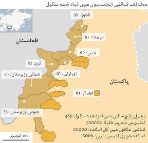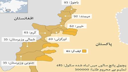 پاکستان کے قبائلی علاقوں میں حکام کے مطابق گزشتہ پانچ برس کے دوران پانچ سو کے قریب تعلیمی ادارے شدت پسندی کے کارروائیوں میں تباہ ہو چکے ہیں جس کی وجہ سے پانچ لاکھ سے زیادہ بچے تعلیم کے حصول سے محروم ہوگئے ہیں۔ بی بی سی کی خصوصی رپورٹ۔