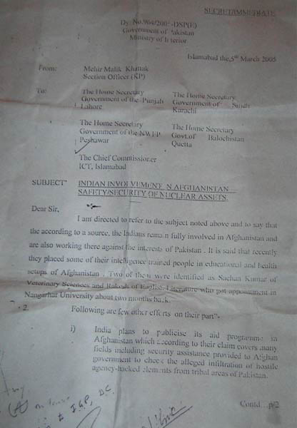 وزارتِ داخلہ نے اس خط میں مزید لکھا ہے کہ افغانستان میں موجود بھارتی اور اسرائیلی ماہرین افغانیوں کے ایک اور گروپ کو بھی اس ضمن میں تیار کر رہے ہیں۔ حکومت کے خط کے مطابق حضرت علی اور حاجی ظاہر نامی دو افراد کو موزوں افغانی باشندوں کو تربیت کے لیے تلاش کا کام دیا گیا ہے۔ وزارتِ داخلہ کے اس خط میں یہ بھی بتایا گیا ہے کہ پچیس جنوری کو بھارت نے جلال آباد میں جعلی پاکستانی کرنسی کے پیکٹ بھی حضرت علی، حاجی ظاہر اور فریدوں کو بھیجے ہیں تاکہ وہ قابل اعتماد ذرائع کی معرفت پشاور کے ایک بازار میں وہ کرنسی پھیلا سکیں۔ حکومت نے چاروں صوبوں اور وفاقی دارالحکومت کی انتظامیہ کو ہدایت کی ہے کہ ایسی صورتحال میں وہ نہ صرف اپنی حدود میں واقع جوہری اثاثوں کی سلامتی اور حفاظت کے لیے اقدامات اٹھائیں بلکہ ملک میں گھس آنے والے عناصروں پر بھی کڑی نظر رکھی جائے، تاکہ کوئی ناخوشگوار واقعہ پیش نہ آئے۔ متعلقہ انتظامیہ کو ہدایت کی گئی ہے کہ اس ضمن میں کیے جانے والے اقدامات سے وزارت داخلہ کو باخبر رکھا جائے۔ |