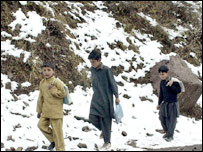 زلزلہ سے متاثرہ علاقوں میں برف باری کے بعد بچے سکول جا رہے ہیں۔