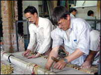 ندیم ملک کا کہنا ہے کہ چوبی قالین عام طور سے دو گانٹھ سے بنائے جاتے ہیں اور اس کی تیاری میں بُنائی کی نئی تکنیکیں اور چھبیس قسم کی اون استمعال کی جاتی ہے۔ نمونوں میں زیادہ تر پھولوں کے نقش بنائے جاتے ہیں لیکن اب جیومیٹریکل ڈیزائن بھی تیار کیے جارہے ہیں۔ نعیم طاہر کا کہنا ہے کہ پاکستان کے بنے ہوئے چوبی قالینوں کو عالمی منڈی میں اتنی پذیرائی ملی کہ ایک سال سے اس کی نقل دوسرے ملکوں جیسے بھارت اور چین میں بھی تیار کی جانے لگی ہے۔ پاکستان کے صنعتکار ان ملکوں میں مشترکہ سرمایہ کاری کررہے ہیں۔ ایکسپورٹر ندیم ملک کا کہنا ہے کہ چوبی قالین تیار کرنے کی ابتداء پاکستان میں مقیم افغان مہاجرین کی بستیوں میں ہوئی جو اس فن سے روایتی طور پر واقف تھے۔ ان کا کہنا ہے کہ اب بھی یہ قالین زیادہ تر صوبہ سرحد میں تیار کیا جارہا ہے اور جب افغان مہاجرین افغانستان واپس چلے گئے تو یہ قالین وہاں سے تیار ہوکر پاکستان آرہا ہے۔ پاکستان آنے والے تیس لاکھ افغان مہاجرین کے ملک پر منفی اثرات کا بیشتر تذکرہ رہتا ہے لیکن پاکستان چوبی قالینوں کی برآمد جو زرمبادلہ میں کماتا ہے وہ بھی افغان مہاجرین کی دین ہے۔ | اسی بارے میں کھڈی بنانے پرعالمی ایوارڈ22 September, 2005 | پاکستان پاکستان کے چالیس لاکھ مزدور بچے 14 June, 2005 | پاکستان | ||||||||||||||||||||||||||||||||||||||||
