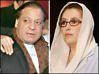 ملاقات میں پی پی پی کی نمائندگی بینظیر بھٹو، مخدوم امین فہیم، واجد شمس الحسن اور ایف آئی اے کے سابق سربراہ رحمٰن ملک نے کی جبکہ نواز لیگ کے وفد میں میاں نواز شریف، میاں شہباز شریف، اے آر ڈی کے سیکریٹری اقبال ظفر جھگڑا اور سید غوث علی شاہ شامل تھے۔ اجلاس کے بعد جاری ہونے والے ایک مشترکہ پریس ریلیز کے مطابق دونوں رہنماؤں نے ملک میں بگڑتی ہوئی سیاسی اور معاشی صورت حال پر تشویش کا اظہار کیا گیا اور ایک قومی اتفاق رائے سے قائم ہونے والی نگران حکومت حکومت کے تحت آزادانہ اور منصفانہ انتخابات کا مطالبہ کیا۔ پریس ریلیز کے مطابق دونوں رہنماؤں نے جمہوریت کی طرف اپنے سفر کو جاری رکھنے اور 1973 کے آئین کی بحالی کے عزم کا اعلان کیا۔ دونوں رہنماؤں نے قومی اسمبلی کے سابق سپیکر یوسف رضا گیلانی، نواز لیگ کے قائم مقام صدر جاوید ہاشمی، ایم این اے خواجہ سعد رفیق، لیگی رہنما زعیم قادری، جنید بلند، بسم اللہ کاکڑ، پیر مکرم، آفاق احمد خان اور عامر خان سمیت تمام سیاسی قیدیوں کی رہائی کا بھی مطالبہ کیا۔ | اسی بارے میں بے نظیر نواز ملاقات کی وڈیو کوریج 24 April, 2006 | پاکستان ’چارٹر آف ڈیموکریسی پرگفتگو‘24 April, 2006 | پاکستان ’مشرف کی پِچ پر نہیں کھیلیں گے‘24 April, 2006 | آس پاس | ||||||||||||||||||||||||||||||||||||||||