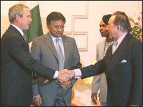 اسلام آباد میں جارج بش کے ساتھ صدر پرویز مشرف اور خورشید احمد قصوری