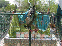 ایک کنال کے رقبے پر پھیلے ہوئے اس مزار کے احاطے میں درختوں کے بڑے بڑے مضبوط خشک تنے پڑے ہوئے ہیں جس پر سینکڑوں کے حساب سے کیلیں ٹھونکی ہوئی نظر آتی ہیں۔