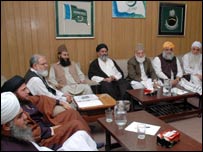 ان کا کہنا تھا کہ پاکستان کی بقا کے لیئے میدانِ عمل میں اترنا وقت کی ضرورت ہے اور عالمِ اسلام اور خصوصاًً پاکستان کے قبائلی علاقوں پر امریکی بمباری اور قتلِ عام ایک ایسا مجرمانہ فعل ہے جس کے خلاف قوم کا یکجا ہونا ناگزیر ہے۔ حافط حسین احمد کے استعفی سے متعلق ایک سوال پر مولانا فضل الرحمان نے کہا کہ ’ان کا استعفی ہمارے پاس ہے اور وہ پارٹی کے فیصلے کے پابند ہیں‘۔ بلوچستاں اسمبلی سے مستعفی ہونے کے بارے میں سوال کا جواب دیتے ہوئے قاضی حسین احمد نے کہا کہ اس اجلاس میں صرف قومی اسمبلی سے استعفے دینے کا متفقہ فیصلہ ہوا ہے جبکہ مولانا فضل الرحمان نے کہا کہ ’ اسمبلیوں سے مستعفی ہونا ایک مرحلہ وار عمل ہے اور ہمیں مرحلہ وار چلنے دیا جائے۔ | اسی بارے میں ایم ایم اےشہادت کے لیے تیار؟13 November, 2006 | پاکستان حدود تنازعہ: آخری مراحل میں14 November, 2006 | پاکستان ’پاکستان فری سیکس زون بن جائےگا‘15 November, 2006 | پاکستان ’انتہا پسندوں کا زور ٹوٹ گیا ہے‘15 November, 2006 | پاکستان حدود بل: جب چاہے قابو کرلو15 November, 2006 | پاکستان پشاور میں حسبہ بل کے خلاف احتجاج 16 November, 2006 | پاکستان حقوق نسواں بل سب سے نمایاں خبر16 November, 2006 | پاکستان | ||||||||||||||||||||||||||||||||||||||||