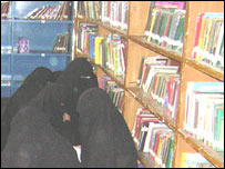 بچوں کی سرکاری لائبریری کی دیوار پر جو لوہے کا جنگلہ ہے اس پر طالبات نے کپڑے لگا کر پردہ کر رکھا ہے اور صدر دروازے کو تالہ لگادیا ہے۔