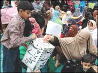 ریلی کے شرکاء جہاد فنڈ میں چندہ دیتے ہوئے