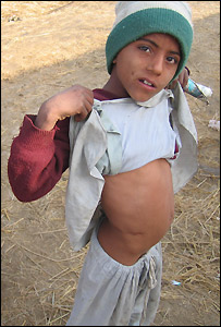 یہ بزرگ خاتون سوئی کے علاقے محمد کالونی کے ایک مزدور سعید خان کی والدہ تھیں۔ سعید خان نے نادرا کا جاری کردہ اپنا شناختی کارڈ جھٹ سے کوٹ کی لٹکی ہوئی جیب سے نکالا۔ کوٹ کیا تھا کچھ چیتھڑے لٹکے ہوئے تھے۔ سعید خان نے بتایا: ’دسمبر دوہزار پانچ میں جب سے ہم نے گھر چھوڑا ہے حکومت نے صرف یہ مدد کی ہے کہ نادرا کی گاڑی نے یہاں بیٹھے بیٹھےسب کا شناختی کارڈ بنا دیا‘۔ اس خالی زمین میں سعید خان کے تین بھائیوں اور سسرالیوں سمیت سات گھرانوں کے تئیس چھوٹے بڑے نفوس ڈنڈوں پر پھٹے پرانے کپڑے اور خشک گھاس کی چھت سی تانے سر چھپانے کی کوشش کررہے ہیں۔ کیا آپ نے ایسی جھونپڑی دیکھی ہے جو تین طرف سے کھلی ہوئی ہو۔ سعید خان کے دو بھائی تلاشِ معاش کے لیے حیدرآباد کی طرف نکل گئے۔ میں نے پوچھا گزارہ کیسے ہوتا ہے؟ کہنے لگا دھان کی فصل کا ایک ایکڑ کاٹنے پر ایک من چاول ملتا تھا۔ چار مہینے یہ کام کیا۔ اب ابلے ہوئے چاول کھاتے ہیں اور یہ جو سامنے پانی جمع ہے اسے ابال کر پیتے ہیں۔ اتنے میں ایک بچہ ابلے ہوئے چاول کی دیگچی اٹھا لایا۔ جوہڑ کے ابلے ہوئے پانی میں ابلے ہوئے چاول۔ ’سائیں آپ کی کیا خاطر کریں بس یہی ہے‘۔ گاڑی آگے بڑھتی چلی گئی۔ ایک بڑی سی کچی چار دیواری نظر آئی۔ گاڑی مڑ گئی۔ دو نوجوان اور کچھ بچے۔ دوتین بچوں کے ہاتھ میں مڑے تڑے سے پہلی جماعت کے قاعدے تھے۔ علی محمد نے بتایا کہ یہ اس نے اپنی جیب سے خریدکر کچھ بچوں کو دیے ہیں۔