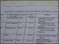 سمجھوتہ ٹرین میں دھماکوں کے نتیجے میں اب تک اڑسٹھ افراد کی ہلاکت کی تصدیق ہوئی ہے جبکہ بارہ افراد زخمی ہیں جنہیں نئی دلی کے صفدر جنگ ہسپتال میں داخل کیا گیا ہے۔ اطلاعات کے مطابق ہسپتال میں داخل افراد میں سے دس پاکستانی جبکہ دو بھارتی ہیں۔ پاکستانی مریضوں کی فہرست 1: رخسانہ ولد زوجہ شوکت علی۔چالیس سال۔سمن آباد، فیصل آباد | اسی بارے میں فون ہیلپ لائن، ویزا کی سہولت19 February, 2007 | پاکستان لواحقین کے لیے خصوصی ٹرین19 February, 2007 | پاکستان ’لوگ جلتے ڈبوں سےکود رہے تھے‘19 February, 2007 | انڈیا | ||||||||||||||||||||||||||||||||||||||||