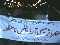 مقررین کا کہنا تھا کہ صحافی آزادی اظہار پر پابندی کے کسی حکم نامے مشعل بردار جلوس پارلیمنٹ سے وزیرِاعظم سیکرٹریٹ کی طرف روانہ ہوا تو سپریم کورٹ کی عمارت کے سامنے خاردار تاریں لگا کر جلوس روکنے کی کوشش کی گئی لیکن مظاہرین نعرہ بازی کرتے ہوئے یہ رکاوٹیں عبور کرگئے۔ اس موقع پر پولیس کی بھاری جمیعت جلوس کے ساتھ تھی۔مظاہرین دو گھنٹے تک احتجاج کرنے کے بعد پرامن طور پر منتشر ہوگئے۔ اس موقع پر موجود سپریم کورٹ بار ایسوسی ایشن کے سابق صدر جسٹس (ر) طارق محمود نے بی بی سی کو بتایا کہ صدر کی طرف سے نشریاتی اداروں کے بارے میں جاری کردہ نئے آرڈیننس کو عدالت میں چیلنج کیا جا سکتا ہے۔ ان کا کہنا تھا کہ’ہراس اقدام کو عدالت میں چیلنج کیا جا سکتا ہے جو دستور میں دیے گئے حقوق کو سلب کرے اور ان حقوق سے متصادم ہو‘۔ ادھر پاکستان فیڈرل یونین آف جرنلسٹس نے اپنے اجلاس میں فیصلہ کیا ہے کہ آزادی صحافت پر پابندیوں اور تشدد کے خلاف سات جون کو صحافی ملک گیر یوم سیاہ منائیں گے اور اس موقع پر ملک بھر کے پریس کلبز پر سیاہ پرچم لہرائے جائیں گے اور صحافی سیاہ پٹیاں باندھیں گے۔ | اسی بارے میں میڈیا پر کنٹرول کے لیے نئے قوانین04 June, 2007 | پاکستان لاہور میں’جیو‘ کی نشریات بند03 June, 2007 | پاکستان کیا حکومت بوکھلا گئی ہے؟01 June, 2007 | پاکستان نشریات جزوی طور پر ’معطل‘01 June, 2007 | پاکستان ہنگاموں کی کوریج، ’آج‘ پر فائرنگ12 May, 2007 | پاکستان جیو ٹی وی پر حملہ ایک ’سازش‘17 March, 2007 | پاکستان صحافیوں کو دھمکی پر احتجاجی مظاہرے30 May, 2007 | پاکستان | ||||||||||||||||||||||||||||||||||||||||