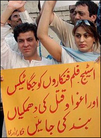 معروف اداکار سہیل احمد کا کہنا ہے کہ ایک طرف روشن خیالی اور اعتدال پسندی کا دعویْ کیا جارہا ہے اور دوسری جانب فنکاروں کو تحفظ حاصل نہیں ہے۔ ’سرسبز پنجاب کا نعرہ لگانے والوں کو خوف زدہ عوام کے چہروں پر زردی نظر نہیں آتی؟‘ ۔ فنکاروں اور پروڈیوسرز نے اعلان کیا ہے کہ اگر حکومت نے فنکاروں کو تحفظ فراہم نہ کیا اور جمعہ تک کوئی کارروائی عمل میں نہ لائی گئی تو تمام سٹیج ڈرامے بند کر دیئے جائینگے۔ واضح رہے کہ کچھ عرصہ قبل بھی دو سٹیج اداکاروں طارق ٹیڈی اور افضل خان المعروف جان ریمبو کو نامعلوم افراد نے اس وقت گولیاں مار کر زخمی کر دیا تھا جب یہ دونوں فنکار گوجرانوالہ میں ڈرامہ پرفارم کر کے لاہور واپس لوٹ رہے تھے۔ فلم اور سٹیج کی معروف اداکارہ اور رقاصہ نرگس بھی اپنے اوپر ہونے والے تشدد کی وجہ سے کچھ عرصہ کے لیے شوبز کی دنیا سے کنارہ کش ہو کر بیرون ملک چلی گئی تھیں۔ |