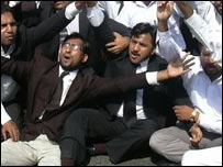 کراچی بار ایسو سی ایشن کی جانب سے احاطے کے اندر احتجاجی مظاہرہ کیا گیا جس میں صدر پرویز مشرف کے خلاف سخت نعرے بازی کی گئی۔ دوسری جانب سندھ ہائی کورٹ کی طرف آنے والی سڑکوں پر بڑی تعداد میں پولیس اہلکار تعینات ہیں اور سڑکوں پر ناکے لگائے گئے ہیں۔