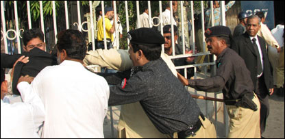 اس دوران پولیس کی ان سے جھڑپیں ہوئی اور پولیس نے بے دریغ لاٹھایاں برسانی شروع کردیں اور وکلاء نے حکومت کے خلاف نعرے لگانے شروع کردیے۔ پولیس اہلکاروں نے تین وکلاء کو دبوچ کر گرفتار کر لیا جس پر وکلاء مزید مشتعل ہوگئے اور ایک مرتبہ پھر وکیل اور پولیس گتھم گتھا ہوگئی۔