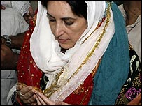 پاکستان پیپلز پارٹی کی چیئر پرسن بے نظیر بھٹو تقریباً نو سال کے بعد پنجاب کے دارالحکومت لاہور پہنچ گئی ہیں۔ائر پورٹ سے وہ سیدھا داتا دربار گئیں جہاں انہوں نے فاتحہ پڑھی اور چادر چڑھائی۔ بے نظیر بھٹو نے کہا ہے لاہور پاکستان کا دل ہے اور یہاں پہنچ کر وہ ایک نیا جذبہ اور طاقت محسوس کررہی ہیں۔ بے نظیر بھٹو لاہور ائر پورٹ پہنچیں تو وہاں دو تین سو کارکن اور پیپلز پارٹی کے عہدیدار موجود تھے جنہوں نے پیپلز پارٹی کے جھنڈے اٹھا رکھے تھے۔ کارکنوں نے انہیں دیکھتے ہی وزیر اعظم بے نظیر کے نعرے لگانےشروع کر دیے۔ لاہور کے علامہ اقبال ائر پورٹ پر انہوں نے ذرائع ابلاغ کے نمائندوں سے گفتگو کرتے ہوئے تازہ آرمی ایکٹ کی مخالفت کی ہے۔ انہوں نے کہا کہ ایسا آرمی ایکٹ جس کے تحت شہریوں کے خلاف بھی فوجی عدالت میں مقدمہ چلایا جائے گا وہ غلط ہے۔انہوں نے کہا کہ یہ انسانی حقوق کی خلاف ورزی بھی ہے اور فوج کے ساتھ بھی ناانصافی ہے۔