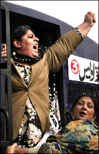 خواتین کارکنوں پر مقدمات دوسری طرف پاکستان پیپلز پارٹی کی چیئر پرسن بینظیر بھٹو کی سینیٹر لطیف کھوسہ کی رہائش گاہ پر نظر بندی جاری ہے اور پولیس کی بھاری نفری اب بھی وہاں موجود ہے۔ بینظیر نے کل سے سخت گیر موقف اختیار کرتے ہوئے کہا ہے کہ وہ جنرل پرویز مشرف سے شراکتِ اقتدار نہیں کر سکتیں اور مطالبہ کیا کہ وہ عہدہ صدارت سے مستعفی ہو جائیں۔ بینظیر بھٹو نے غیرملکی نشریاتی اداروں کو انٹرویو دیتے ہوئے کہا کہ ’صدر کو اب جانا چاہیئے۔ آمریت کا دور ختم ہو چکا ہے۔‘ دریں اثناء واشنگٹن میں وائٹ ہاؤس نے اعلان کیا ہے کہ ڈپٹی سیکریٹری آف اسٹیٹ جان نیگرو پونٹے اس ہفتے جنرل مشرف کو ایمرجنسی ختم کرنے پر رضامند کرنے کے لیے اسلام آباد جائیں گے۔ واشنگٹن میں بی بی سی کے نامہ نگار کے مطابق جنرل مشرف کی طرف سے حالیہ اقدامات کی وجہ سے بش انتظامیہ کو مشرف حکومت سے اپنے تعلقات کا دفاع کرنے میں مشکلات پیش آ رہی ہیں۔ بینظیر بھٹو نے گزشتہ روز اپنی قیام گاہ سے مختلف سیاسی رہنماؤں سے رابطہ کرنے کی کوشش کی اور اطلاعات کے مطابق جماعتِ اسلامی کے امیر قاضی حسین احمد سے ان کی بات چیت ہوئی۔ پی پی پی نے ان خبروں پر کوئی تبصرہ نہیں کیا لیکن جماعت اسلامی اور مجلس عمل کے ترجمان کے مطابق دونوں رہنماؤں کے درمیان رابطے رکھنے پر اتفاق ہوا ہے اور آئندہ چند روز میں ملاقات کا امکان بھی موجود ہے۔ صحافیوں کی علامتی بھوک ہڑتال کراچی میں صحافی برادری یہ احتجاج پی ایف یو جے یعنی پاکستان فیڈرل یونین آف جرنلسٹس کی ذیلی تنظیم کراچی یونین آف جرنلسٹس کے پلیٹ فارم سے کررہی ہے جس میں دیگر صحافی تنظیمیں بھی شامل ہیں۔ کراچی پریس کلب کے سامنے ایک احتجاجی کیمپ لگایا گیا جس میں مختلف اخبارات، رسائل، اور الیکٹرانک میڈیا سے تعلق رکھنے والے صحافیوں نے بھوک ہڑتالی کیمپ میں شرکت کرکے اپنی وحدت کا ثبوت دیا اور میڈیا پر لگائی گئی پابندیوں کے خلاف نعرے بازی کی۔ کیمپ میں مختلف بینرز اور پلے کارڈز بھی آویزاں کیے گئے تھے جن میں نعرے تحریر تھے، ان نعروں میں آزادیِ صحافت زندہ باد، پیمرا آرڈیننس میں ترامیم واپس لو، پی سی او نامنظور، ایسے دستور ہم نہیں مانتے وغیرہ شامل تھے۔ کراچی میں احتجاجی مظاہرے ہمارے نامہ نگار ریاض سہیل کے مطابق بینظیر بھٹو کی نظربندی کے خلاف کراچی میں دوسرے روز بھی پاکستان پیپلز پارٹی کے اکثریتی علاقوں میں بدھ کو دوسرے روز بھی احتجاج کا سلسلہ جاری رہا۔ احتجاجکا زیادہ زور لیاری میں دیکھنے میں آیا جہاں ہوائی فائرنگ کی گئی اور جس کے بعد اکثر کاروبار بند ہوگیا۔ ادھر گزشتہ روز پریس کلب سے باہر احتجاج کے دوران گرفتار ہونے والی پیپلز پارٹی کی اراکین کو رہا کردیا گیا ہے۔ عوامی تحریک کے مزید چار کارکنوں نے گرفتاریاں پیش کیں۔ ایمرجنسی کے نفاذ، ججوں کی برطرفی اور بنیادی حقوق کی معطلی کے خلاف وکلا تنظیموں نے بدھ کو بھی ہائی کورٹ کا مکمل اور ماتحت عدالتوں کا علامتی بائیکاٹ جاری رکھا۔ سندھ میں مظاہرے، گرفتاریاں ہمارے نامہ نگار نثار کھوکھر کا کہنا ہے کہ پیپلز پارٹی کی سربراہ بینظیر بھٹو کی نظربندی اور ایمرجنسی کے خلاف بدھ کے روز اندرون سندھ کے اکثر شہروں میں احتجاج کیا گیا ہے ۔ بعض شہروں میں ہڑتال ہوئی ہے جبکہ ایک سابق صوبائی وزیر اور چار اراکین اسمبلی سمیت درجنوں پی پی رہنماؤں کو گرفتار کیا گیا ہے ۔ بینظیر بھٹو کے آبائی شہر لاڑکانہ میں پیپلز پارٹی کے رہنماؤں نے آج دوسری دن بھی احتجاج کرنے کی کوشش کی مگر پولیس نے مظاہرین پر لاٹھی چارج اور اشک آور گیس کا استعمال کیا ہے۔ عینی شاہدین کےمطابق لاڑکانہ میں پیپلز پارٹی کی جانب سے تین مختلف مقامات سے جلوس نکالنےکی کوشش کی گئی۔ ایک بڑا جلوس پی پی رہنماء نثار احمد کھوڑو کی رہائش گاہ سے ان کی قیادت میں نکالا گیا مگر چند قدموں کا فاصلہ طے کرنےکے بعد پولیس کی بھاری نفری نے جلوس کو گھرے میں لے لیا اور جلوس کے شرکاء پر اشک آور گیس اور لاٹھیوں کا استعمال کیا گیا۔ نثار احمد کھوڑو کےمطابق پولیس نے ان کے پچاس کارکنان کو گ
