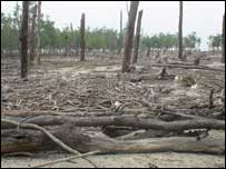 سندربن میں گھومتے ہوئے بعض جگہوں پر درختوں کے جھنڈ کے جھنڈ سوکھ کر گرے ہوئے دیکھے۔ اس کی وجہ بتاتے ہوئے ڈاکٹر عتیق نے کہا کہ سائیکلون یا سمندر طوفان اپنے ساتھ ریت لاتے ہیں اور سانس لیتی جڑیں اس کے نیچے دب جاتی ہیں، جس سے درختوں کو آکسیجن نہیں ملتی، نمکیات میں اضافہ ہوجاتا ہے اور وہ سوکھ کر گرنا شروع ہوجاتے ہیں۔