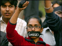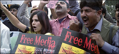 کراچی میں ملازمین کا احتجاج اسی دوران پولیس کی بھاری نفری نے گورنر ہاؤس کو جانے والے راستے کو مسلم جیم خانہ کے قریب پولیس موبائلیں کھڑی کر کے روکنے کی کوشش کی تاہم متعلقہ چینل کے صحافیوں کا احتجاجی جلوس رکاوٹ عبور کرکے آگے بڑھتا گیا جس کے کچھ آگے پولیس نے مزید نفری کی مدد سے گونر ہاؤس کے قریب سڑک کو بلاک کر دیا۔ اس مقام پر پولیس نے صحافیوں کو گورنر ہاؤس جانے سے روکنے کے لیے کھڑی کی گئی پولیس موبائلوں کے آگے اور پیچھے ڈنڈہ بردار اہلکاروں کو قطار میں کھڑا کردیا۔ اس موقع پر پولیس اور صحافیوں کے درمیاں ہاتھاپائی بھی ہوئی، تاہم جیو ٹیلی ویژن کے بعض احتجاجی کارکنوں کی مداخلت پر صحافیوں نے واپسی اختیار کی۔ اس مقام پر چینل کے بعض کارکنوں نے احتجاج اتوار تک مؤخر کرنے کا باقاعدہ اعلان کرتے ہوئے، چینلز کی بندش کے بارے میں حکومت پر تنقید کی ہے۔ لاہور پریس کے باہر مظاہرہ مظاہرے میں صحافیوں کے علاوہ انسانی حقوق کمیشن کی سربراہ عاصمہ جہانگیر، وکلاء اور سول سوسائٹی کے ارکان نے شرکت کی۔ صحافی نعرہ لگا رہے تھے: لاٹھی گولی کی سرکار نہیں چلے گی نہیں گی، پمرا آرڈیننس نامنظور اور آزادی صحافت تک جنگ رہے جنگ رہے۔ پنجاب یونین آف جرنلسٹ کے صدر عارف حمید بھٹی نے ٹی وی چینلز جیو اور اے آر وائی کی نشریات کی بندش اور میڈیا پر عائد پابندیوں کی شدید مذمت کی اور کہا کہ صحافی پابندیوں کے خلاف بغاوت کرتے ہیں۔ ان کا کہنا ہے کہ اخباری مالکان بھی آزادی صحافت کے لیے باہر آئیں۔ عارف حمید نے اعلان کیا کہ اتوار سے لاہور پریس کلب میں روزانہ ایک گھنٹے کی علامتی بھوک ہڑتال کی جائے جبکہ بیس نومبر سے صحافی گرفتاریاں دیں گے۔ پشاور میں صحافیوں کا احتجاج سنیچر کی صبح ہونے والے اس مظاہرے میں ’ جیو‘ اور ’ اے آر وائی‘ کے ملازمین کے علاوہ الیٹرانک اور پرنٹ میڈیا سے تعلق رکھنے والے دیگرصحافیوں نے بھی بڑی تعداد میں شرکت کی۔ مظاہرین نے پریس کلب سے ریلی نکالی اور حکومتی پابندی کے خلاف نعرے بازی کی۔ مظاہرین نے ہاتھ میں بینرز اٹھا رکھے تھے جن پر ’میڈیا پر پابندی نامنظور اور جیو کو جینے دو مشرف‘ جیسے نعرے درج تھے جبکہ دونوں چینلز کے بعض ملازمین نے اپنے منہ پر تالے لگائے ہوئے تھے۔ |
