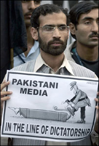 پی بی اے کے سیکریٹری جنرل سرفراز شاہ جو’اپنا‘ چینل کے مالک ہیں ان کا کہنا ہے کہ ’جیو‘ اور ’اے آر وائی‘ کی بین الاقوامی نشریات بند ہوئے ابھی چند ہی گھنٹے ہوئے ہیں اور ممکن ہے شام تک پی بی اے کے ارکان اس صورتحال پر غور کریں۔ پی بی اے کے چیئرمین سلمان اقبال جو ’اے آر وائے ٹی وی نیٹ ورک‘ کے مالک ہیں، وہ کہتے ہیں کہ وہ ابھی تو یہی جاننے کی کوشش کررہے ہیں کہ ان کے چینل کی بین الاقوامی نشریات کیوں بند کرائی گئیں اور اس مسئلے کو کیسے حل کرایا جائے۔ ان کا کہنا ہے کہ وہ خود اسلام آباد میں ہیں اور ’جیو‘ ٹی وی کے مالک میر شکیل الرحمان دبئی میں ہیں اس لیے پی بی اے کا اجلاس ان دونوں کی کراچی واپسی کے بعد ہی ممکن ہوگا۔ نیویارک میں مظاہرے جمعہ کو نیویارک میں پاکستان کے قونصل خانے کے سامنے میڈیا اور سول سوسائٹی سے تعلق رکھنے والے صحافیوں، سیاسی اور انسانی حقوق کے سرگرم کارکنوں نے احتجاجی مظاہرہ کیا جس میں مشرف حکومت، ایمرجنسی اور میڈیا پر پابندیوں کے خلاف زبردست نعرے بازے کی گئی۔ احتجاج میں پاکستان نژاد صحافیوں اور پاکستان کے اخبارات کے پبلشرز کی ایک بڑی تعداد کے علاوہ پاکستان مسلم لیگ نواز گروپ، عوامی نیشنل پارٹی، پاکستان یو ایس اے فریڈم فورم اور خیبر سوسائٹی کے کارکنوں اور رہنمائوں نے بھی شرکت کی۔ نیویارک میں کمیٹی ٹو پروٹیکٹ جرنلسٹس (سی پی جے) کے ایگزیکٹو ڈائریکٹر جیول نوئیل نے ’جیو‘ اور ’اے آر وائی ڈیجیٹل‘ پر پرمتحدہ عرب امارات کی وزارتِ اطلاعات کی طرف سے پابندیوں پر سخت تشویش کا اظہار کیا۔ انہوں نے متحدہ عرب امارات اور پاکستان کی حکومتوں سے ان چینلز کی نشریات کی فوری بحالی کا مطالبہ کیا ہے۔