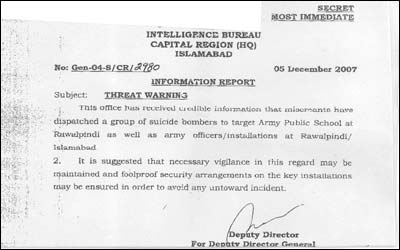 ادھر اس سرکاری دستاویز میں اسلام آباد اور راولپنڈی کی پولیس کے سربراہوں سے کہا گیا ہے کہ وہ اہم سرکاری تنصیبات کے اردگرد حفاظتی اقدامات مزید سخت کردیں اور مشکوک افراد پر کڑی نظر رکھیں۔