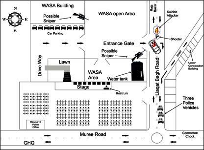 لیکن ابن رضوی کہتے ہیں کہ ’دنیا نے دیکھا ہے، ویڈیو فوٹیجز موجود ہیں کہ پولیس کی گاڑیاں مری روڈ پر پہنچ چکی تھیں، اگر پولیس والے ساتھ ہوتے تو کیا صرف ایک پولیس اہلکار ہلاک ہوتا؟ میں دعوے سے کہتا ہوں کہ راولپنڈی کو پانی فراہم کرنے والے ادارے واسا کی عمارت میں آٹھ دس مشکوک افراد بیٹھے رہے۔ میں نے خود پولیس سے کہا کہ انہیں ہٹاؤ لیکن پولیس والوں نے کہا کہ یہ لوگ ڈیوٹی پر ہیں۔میں نے زیر تعمیر عمارت کے اوپر بیٹھے چادر اوڑھے داڑھی والے شخص کو ہٹانے کا کہا تو بھی پولیس نے انہیں نہیں ہٹایا‘۔ ان کا کہنا ہے کہ ’میں جلسہ کی انتظامی کمیٹی میں شامل تھا اور پولیس کے ساتھ طے ہوا تھا کہ بی بی آئیں گی مری روڈ سے اور واپس گوال منڈی سے جائیں گی، کیونکہ جلسہ ختم ہونے کے بعد عوام مری روڈ پر آجاتے ہیں۔ بھٹو صاحب ہوں یا بینظیر جب بھی لیاقت باغ آئے تو واپسی کا روٹ ہمیشہ گوال منڈی کی طرف سے رہا‘۔ اس بارے میں پولیس چیف کہتے ہیں کہ ’ہمارے پاس تحریری ثبوت موجود ہے کہ بینظیر بھٹو کی واپیس کا روٹ گوال منڈی سے طے نہیں ہوا تھا۔ پولیس کی تینوں گاڑیاں بینظیر بھٹو کے ساتھ تھیں تب ہی تو پولیس اہلکار زخمی ہوئے‘۔ ابن رضوی کہتے ہیں کہ ’محترمہ پر تین سمتوں سے فائرنگ ہوئی، اندھیرے میں کالے شیشوں والی عینک پہنے کمانڈو نما شخص کھلم کھلا پستول لے کر واسا کی عمارت سے باہر آیا، پولیس نے اُسے نہیں روکا اور اس نے بی بی کی گاڑی کے بائیں جانب فائرنگ کی اور دھماکہ بھی بائیں جانب ہوا۔ لیکن محترمہ کے سر پر زخم دائیں طرف کیسے ہوگیا؟ مجھے یقین ہے کہ بی بی کو کسی ماہر نشانچی نے واسا کی عمارت یا پانی کے ٹینک کے اوپر سے نشانہ بنایا ہے‘۔ اس بارے میں اصل حقائق تو سکاٹ لینڈ یارڈ کے ماہرین کی رپورٹ سے ہی پتہ چلیں گے۔ بینظیر بھٹو کی میڈیا ٹیم کے رکن نذیر دھوکی کہتے ہیں کہ ’حکومت اس بات کا جواب دے کہ بینظیر بھٹو کے ساتھ ایمبولینس کیوں نہیں