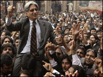 اعتزاز احسن کے لاہور ہائی کورٹ بار پہنچنے پر ان کا والہانہ استقبال کیا گیا اور وکلاء نے اعتزاز احسن کو اپنے کندھوں پر اٹھا لیا۔ اس موقع پر اعتزاز احسن نے’ گو مشرف گو‘ کے نعرے لگائے۔ وکلاء نے’اعتزاز تیرے جان نثار بے شمار بے شمار اور نو مارچ لانگ مارچ‘ کے نعرے بھی لگائے۔ اعتزاز احسن نےلاہور ہائی کورٹ کے نئے ایڈیشنل جج اور لاہور ہائی کورٹ بار کے سابق صدر احسن بھون کے کمرہ عدالت کے سامنے وکلاء سے خطاب کیا۔ اعتزاز احسن نےاس عزم کا اعادہ کیا کہ وکلاء ملک میں آزاد عدلیہ کودوبارہ بحال کرائیں گے۔ ان کا کہنا ہے کہ جو لوگ یہ کہتے ہیں کہ ججوں کی بحالی کے لیے پارلیمنٹ سے آئینی ترمیم چاہئے وہ پی سی او کو قبول کررہے ہیں۔ ان کے بقول کل کوئی نیا فوجی کمانڈر ایک دن کے لیے ایمرجنسی لگائے اور آئین میں ترمیم کرے، پارلیمان کے باب کو پھاڑ دے اور پھر آئین بحال کردے اور اعلان کرے کہ یہ ترمیم شدہ آئین اب پاکستان کا آئین تو یہ ہمیں منظور نہیں ہے۔ انہوں نے کہا کہ آصف زرداری اور نواز شریف کے درمیان جو معاہدے ہوا ہے اس کی پہلی شق عدلیہ کی بحالی ہے۔ اعتزاز احسن نے کہا کہ چیف جسٹس ہاؤس خالی کرنے کا کہتے ہیں، لیکن سابق آرمی چیف سے آرمی ہاؤس خالی کرائیں۔
