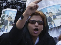 مظاہرین نےمعزول چیف جسٹس افتخار محمد چوہدری سمیت پی سی او کے تحت حلف نہ اٹھانے والے ججوں کی بحالی کے حق میں نعرے لگا ئے۔