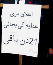 پنجاب کے صوبائی دارالحکومت لاہور میں وکلاء رہنماؤں نے احتجاجی جلوس سے خطاب کرتے ہوئے نومنتخب حکومت کو باور کرایا کہ اعلان مری کے مطابق معزول ججوں کو بحال نہ کیا گیا تو تیس دنوں کی تکمیل کے بعد سیاسی جماعتوں کے اقتدار کے خاتمہ کے لیے الٹی گنتی شروع ہو جائے گی۔