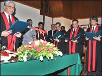 جن معزول ججوں نے اپنے عہدے کا حلف اٹھایا ان میں جسٹس میاں ثاقب نثار، جسٹس آصف سعید کھوسہ، جسٹس شیخ عظمت سعید اور جسٹس عمر عطا بندیال شامل ہیں۔ چیف جسٹس لاہور ہائی کورٹ مسٹر جسٹس سید زاہد حسین نے ان ججوں سے حلف لیا۔ سیکریٹری قانون آغا رفیق نے بتایا کہ ایک نوٹیفیکیشن کے تحت لاہور ہائی کورٹ میں ججوں کی تعداد پچاس سے بڑھ کر ساٹھ کردی گئی ہے۔ سیکریٹری قانون آغا رفیق نے بی بی سی کو بتایا کہ دوبارہ حلف اٹھانے والے ان معزول ججوں کی سینیارٹی میں کوئی تبدیلی نہیں ہوگی اور ان کو وہی سینیارٹی حاصل ہوگی جو تین نومبر سنہ دو ہزار سات کو تھی۔