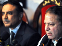 بینظیر بھٹو کے قتل سے آٹھ جنوری کے مجوزہ عام انتخابات اٹھارہ فروری تک ملتوی ہوگئے اور جب اٹھارہ فروری کو انتخابات منعقد ہوئے تو ایسا لگ رہا تھا کہ انتخابات میں دھاندلی ہوگی اور اس وقت کے صدر پرویز مشرف اپنے ساتھیوں کو کامیاب کروائیں گے۔ انتخابات کے روز کراچی اور گجرات سمیت مختلف علاقوں میں ڈبے بھرنے کے الزامات تو لگے لیکن پہلی بار پاکستان میں کسی انتخاب کے نتائج کو ہارنے اور جیتنے والوں نے کھلے دل سے تسلیم کرکے نئی روایت ڈالی۔ ماضی کی دو بڑی حریف سیاسی جماعتوں پیپلز پارٹی اور مسلم لیگ (ن) نے دیگر جماعتوں سے مل کر مشترکہ حکومت بنائی جو اس وقت کے صدر پرویز مشرف کے لیے ایک بڑا دھچکہ ثابت ہوا۔ مسلم لیگ (ن) نے صدر پرویز مشرف کو گرفتار کرکے آئین توڑنے کے الزام میں ان پر بغاوت کا مقدمہ چلانے کا مطالبہ کیا۔ حالات ایسے پلٹے کہ صدر پرویز مشرف کے خلاف کیسٹ کمپنیوں نے نئےگیت متعارف کروائے۔ ’جا مشرف جا ساڈی فرمائش تے‘ کا ایک گیت بڑا مشہور ہوا۔ لیکن حکومتی اتحاد کے سربراہ آصف علی زرداری نے اس بارے میں احتیاط برتی۔ بعد میں موقع پاتے ہیں پرویز مشرف کو الٹی میٹم دیا کہ مستعفی ہوجائیں ورنہ محاسبے کے لیے تیار ہوجائیں۔ پرویز مشرف کے گرد گھیرا تنگ ہوا اور انہوں نے براہ راست ٹی وی پر خطاب کے دوران مستعفی ہونے کا اعلان کیا۔ وہ پہلے فوجی صدر ہیں جنہیں فوجی سلامی دے کر رخصت کیا گیا۔ پرویز مشرف کے مستعفی ہونے کے بعد ان کے ہاتھوں برطرف ججوں کی بحالی کے لیے مسلم لیگ (ن) نے آصف زرداری سے کیے گیے معاہدے کے تحت بحالی کا کہا تو آصف زرداری نے انکار کیا۔ انہوں نے کہا کہ ’سیاسی معاہدے کوئی قرآنی آیات یا حدیث نہیں ہوتے۔‘