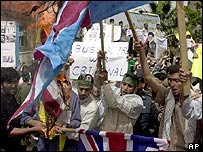 مظاہرین نے تہران میں برطانوی ایمبیسی پر پتھراؤ بھی کیا لیکن کوئی خاص نقصان نہیں ہوا۔ مظاہرین نے پلے کارڈ اٹھا رکھے تھے جن پر نجف اور کربلا کے مقدس شہروں میں امریکی فوج کی کاروائی کے خلاف نعرے درج تھے۔