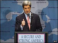 ڈیموکریٹک پارٹی کے صدارتی امیدوار جان کیری نے کہا ہے کہ اگر وہ منتخب ہوگئے تو وہ دہشت گردی کے خلاف لڑنے کے لیے عالمی سطح پر نئے اتحادی بنائیں گے۔ قومی سلامتی کے موضوں پر تقریر کرتے ہوئے جان کیری نےکہا کہ صدارتی انتخابات میں کامیابی حاصل کرنے کے بعد ان کی ترجیح ہو گی کہ دہشت گردوں کے ہاتھ وسیع پیمانے پر تباہی پھیلانے والے ہتھیار نہ لگیں۔ صدر بش کے عراق پر حملہ کرنے کے فیصلے پر تنقید کرتے ہوئے انہوں نے کہا کہ