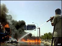 عراقی دارالحکومت بغداد میں ہونے والے ایک خودکش کار بم حملے میں کم از کم بارہ افراد ہلاک ہو گئے ہیں جن میں چار پولیس اہلکار بھی شامل ہیں۔ اطلاعات کے مطابق گشت کرنے والی ایک ٹیم نے ارکان نے غلط سمت میں جاتی ہوئی ایک گاڑی کو روکا۔ جونہی ان اہلکاروں نے گاڑی کو روکا وہ دھماکے سے پھٹ گئی۔ بغداد میں قائم فوجی کیمپ کے قریب ہونے والے اس دھماکے سے متعدد افراد زخمی اور کم از کم آٹھ گاڑیاں تباہ ہو گئیں۔ عراق میں ایک ہفتے سے بھی کم عرصے میں یہ کار بم دھماکے کا تیسرا واقعہ ہے۔ بمبار حملہ آوروں نے منگل کو ملک کے دیگر دو شہروں میں بھی کارروائیاں کیں جن کے نتیجے میں پندرہ افراد ہلاک ہو گئے۔ ہلاک ہونے والوں میں ایک امریکی فوجی بھی شامل ہے۔ عینی شاہدین کے مطابق دھماکوں کے باعث دریائے دجلہ کے کنارے دھویں کے بادل اٹھتے دکھائی دیئے ہیں۔ امریکی فوج کے صدر دفاتر کو بارہا حملوں کا نشانہ بنایا جاتا رہا ہے۔ گزشتہ ہفتے امریکی فوج کے صدر دفتر پر راکٹ سے کیےگئے ایسے ہی ایک حملے میں دو برطانوی ہلاک ہو گئے تھے۔ اس کے علاوہ بغداد کے مغربی حصے میں وزارت تعلیم کے ایک سینیئر اہلکار کمال الجراح کو گولی مار کر ہلاک کر دیا گیا ہے۔ یہ واقعہ اس وقت پیش آیا جب کمال، غزالیہ ضلع میں واقع اپنے دفتر روانہ ہونے کے لیے گھر سے نکلے۔ اس جان لیوا حملے سے ایک روز قبل بعض نامعلوم مسلح افراد نے بغداد میں عبوری حکومت کے وزیر خارجہ بسام کبہ کو بھی ہلاک کر دیا تھا۔ |